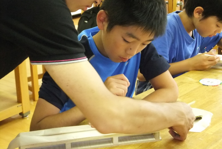 番外編で、トンボの標本のつくり方の指導中の小川リーダー。